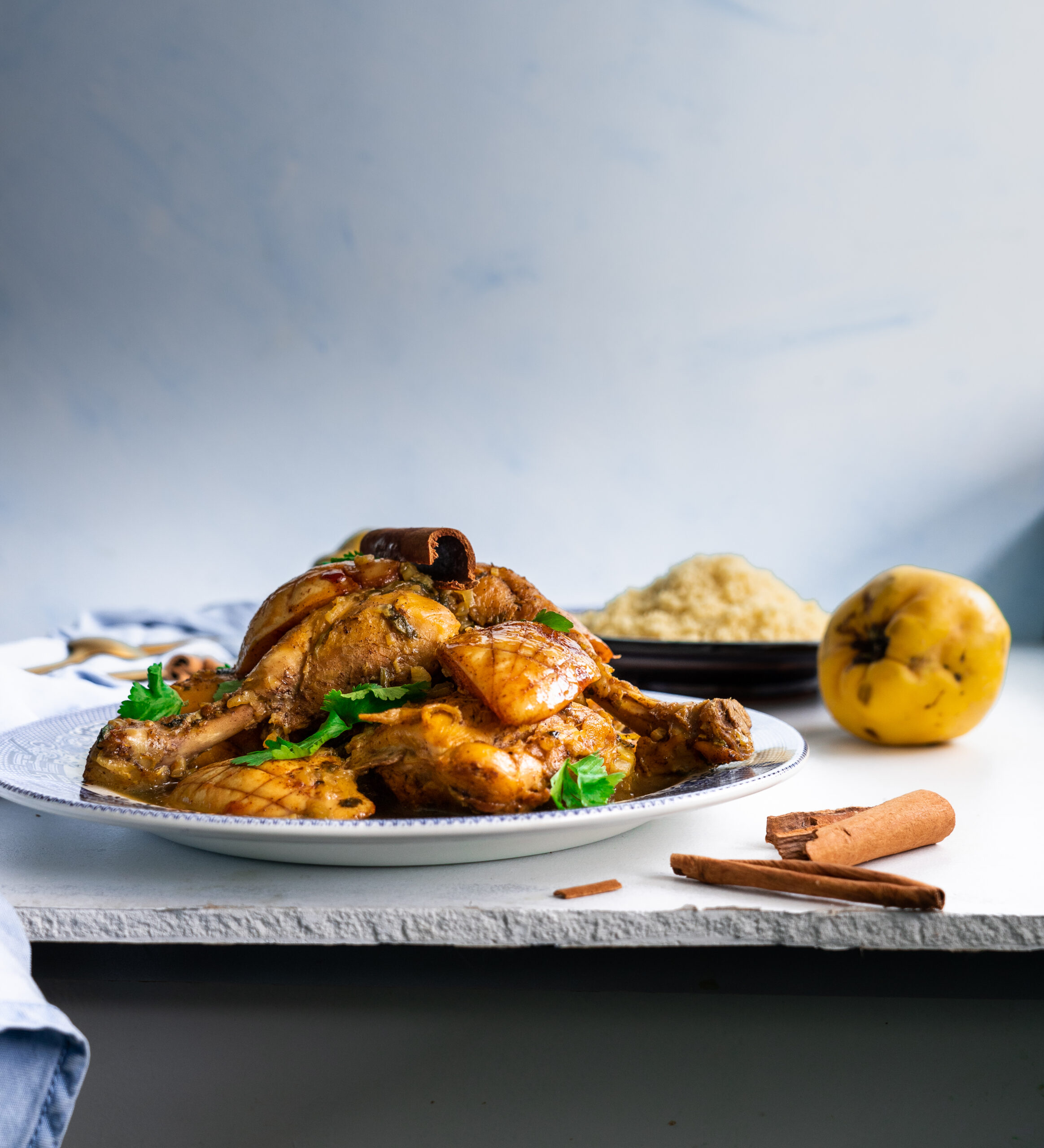 To serve the Chicken Tagine, add the chicken pieces to a plate, then add the quince pieces, then the sauce and top everything with coriander.