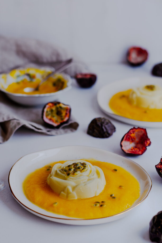In a pot, add the cream, milk, sugar and passion fruit juice and bring everything close to a boil until the sugar has melted. Leave aside to cool.
