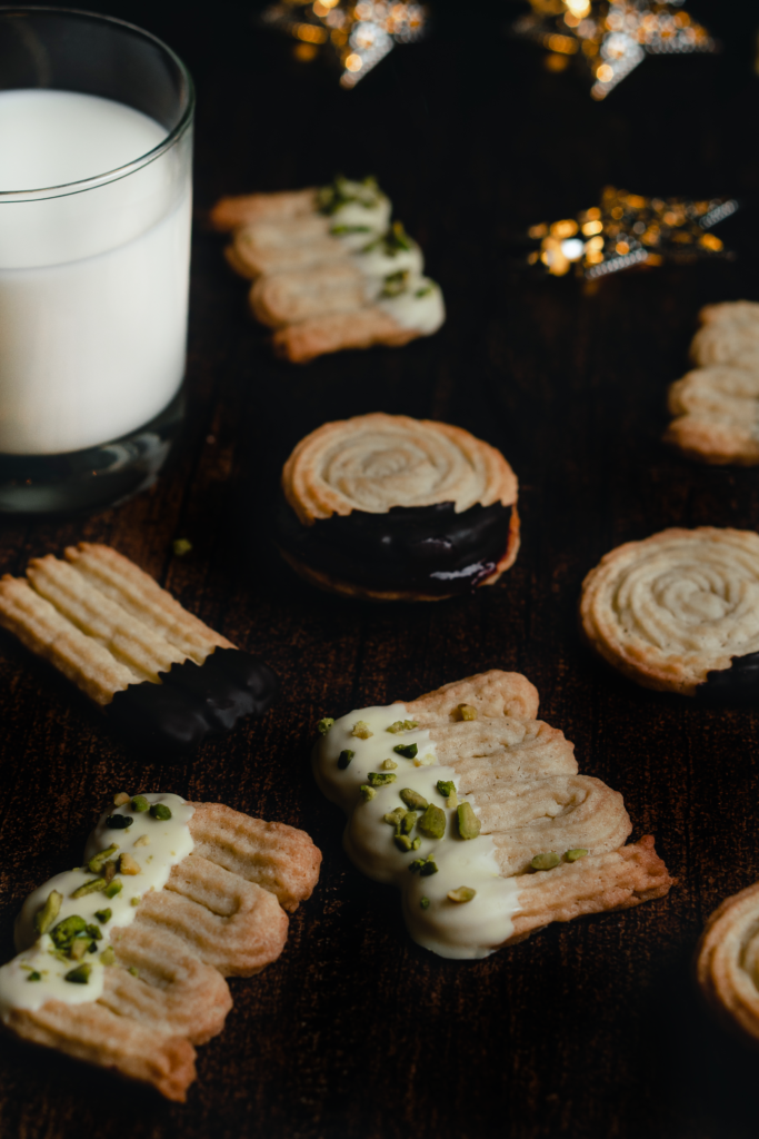 Melt the 2 types of chocolate over bain-marie, then take the cookies and dip half of them into the dark chocolate and the rest in white chocolate (make sure they are fully cooled when dipping). Place them on a baking sheet and place them in the fridge for 5-10 minutes until the chocolate is set). Decorate the white chocolate cookies with the chopped pistachios. Glue some cookies together with the jam as well. Enjoy with a hot cup of coffee/tea/milk!