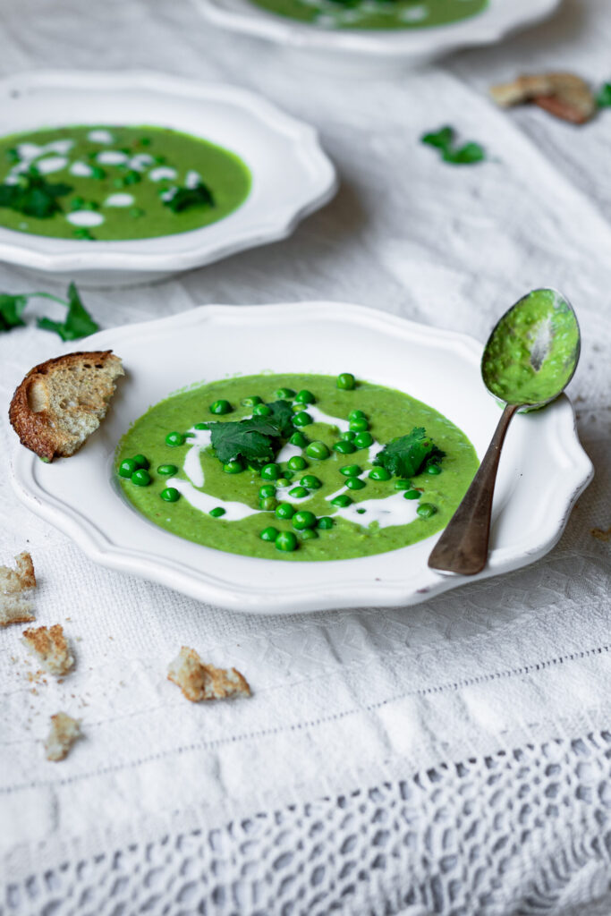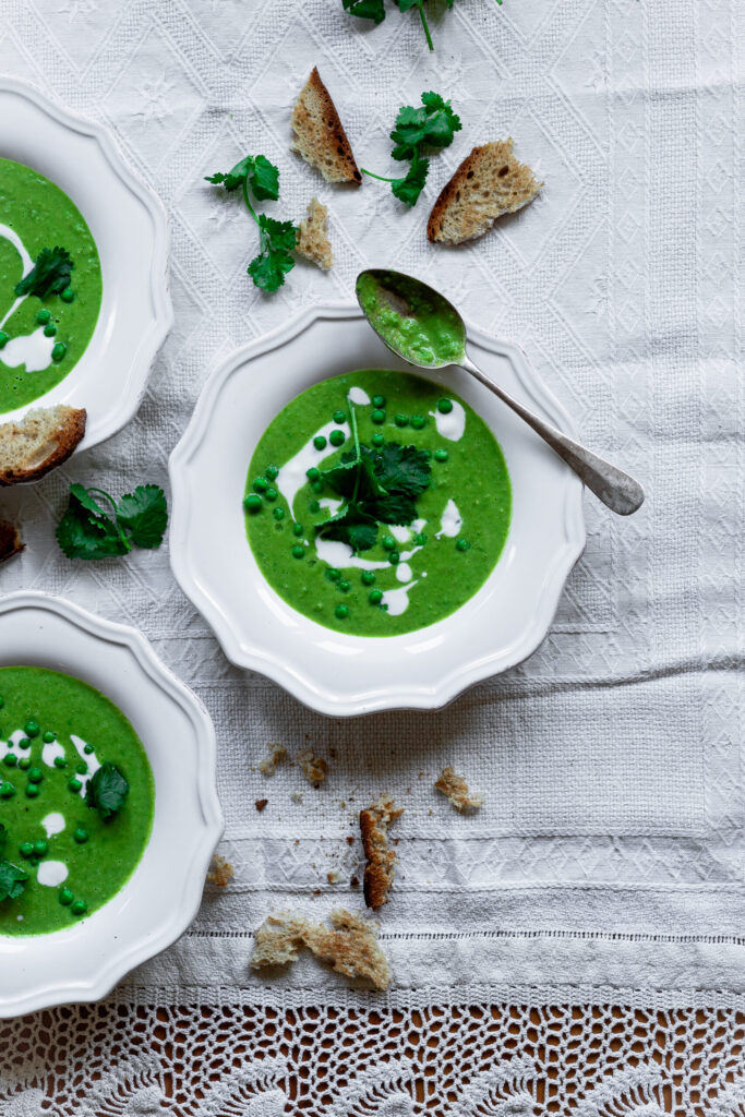 After 10 minutes, you can turn down the heat and mix everything with a vertical blender. You should still have a vibrant green colour as we boiled everything for 10 minutes only. Serve with extra coconut milk ot coconut yogurt and decorate with coriander and green peas. Enjoy!
